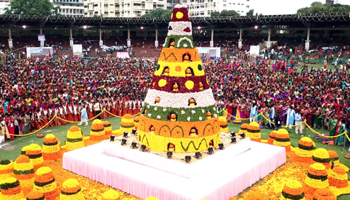 Bathukamma represents cultural spirit of Telangana. Bathukamma is a beautiful flower stack, arranged with different unique seasonal flowers most of them with medicinal values, in seven concentric layers in the shape of temple gopuram. In Telugu, ‘Bathukamma' means ‘Mother Goddess come Alive’ and Goddess Maha Gauri-‘Life Giver’ is worshipped in the form of Bathukamma – the patron goddess of womanhood, Maha Gauri Devi.